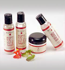 This three step process includes soothing the skin with herbal oils formulated NOT to aggravate acne; healing the skin with an herbal mask and de-stressing the skin with massage and relaxation techniques. Using the Bindi products every night apply a 40 minute clay and spice mask; a zinc-oxide/calamine lotion soothes irritated,acne prone areas. Finish off with a pat of a non-oily herbal moisturizer.